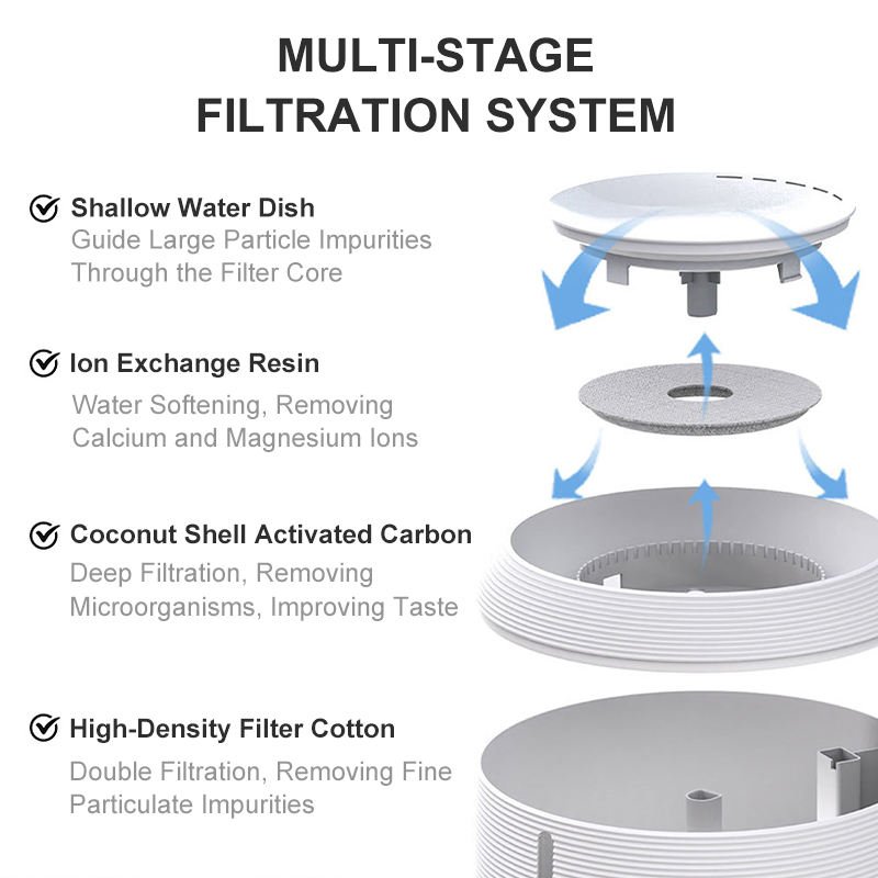 【Flowing Water Filtration System】 The cat waterer with filter, which is made of high-density cotton, activated carbon and ion exchange resin. It can filter out the impurities, remove the peculiar smell, soften the water quality. The living water dispenser is rich in oxygen ions and active H2O molecules, which taste better and fresher to make your pets drink healthier, purer water!