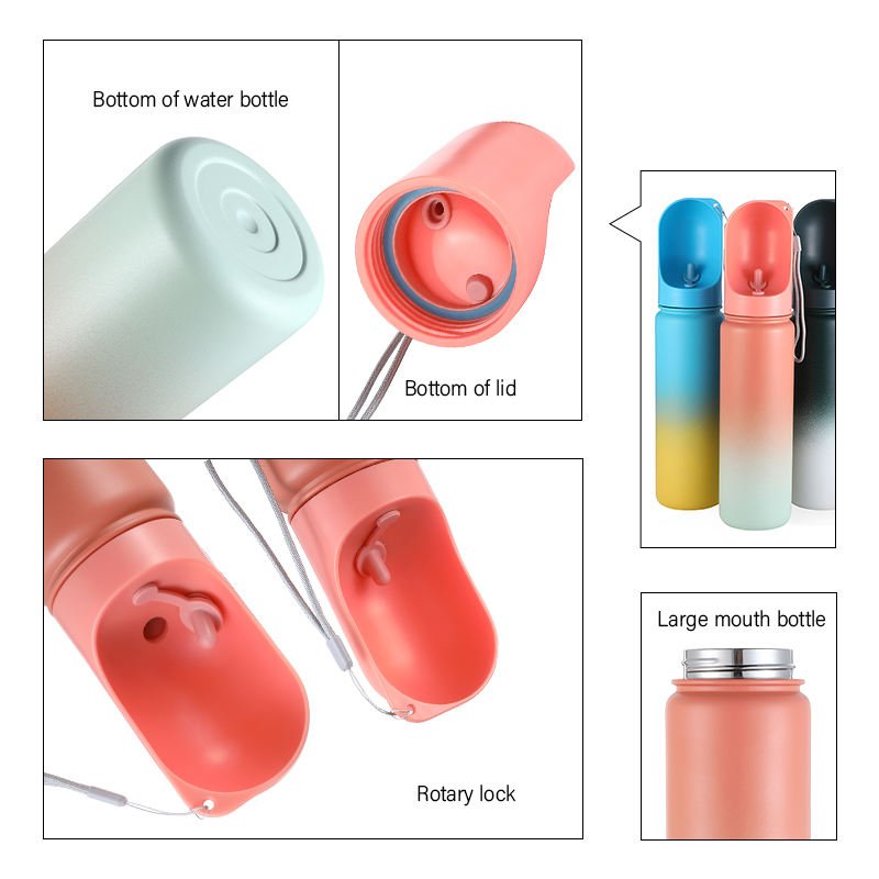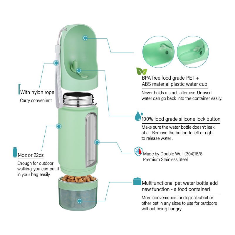 5. Multifunctional pet water bottle add new function -a food container!More convenience for dog.cat,rabbit orother pet in any sizes to use for outdoors without being hungry.