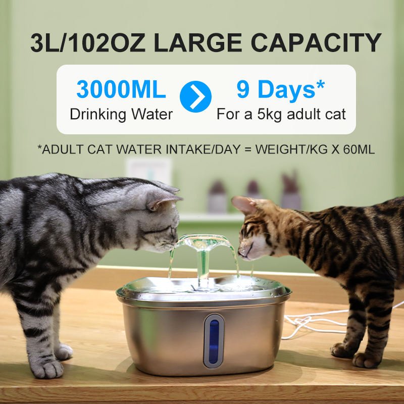 【2.5L Tank capacity with Water Level Window】Watching the pet fountain light indicator,Blue: Normal, Red: Add water. 84.5oz/2.5L, keep your cats hydrated for up to 7 days. Yet changing the water daily would be better.