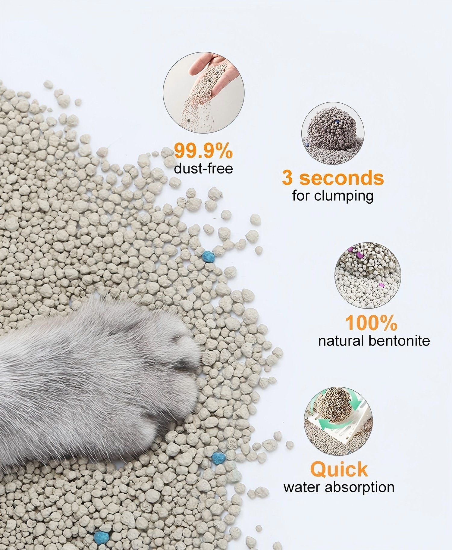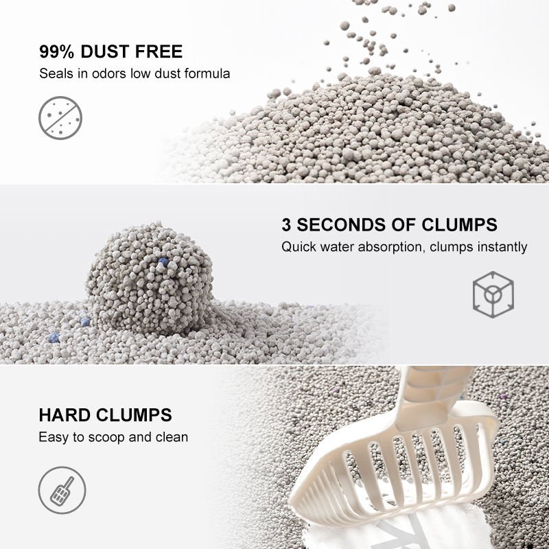 | Advantages | 1.Strong water absorption,tight clumpingand easy to clean. 2.Low dust design to protect respiratory health. 3.Powerful odor control,long-lasting freshness. 4.High cost-effectiveness:economical and durablesuitable for frequent use. |