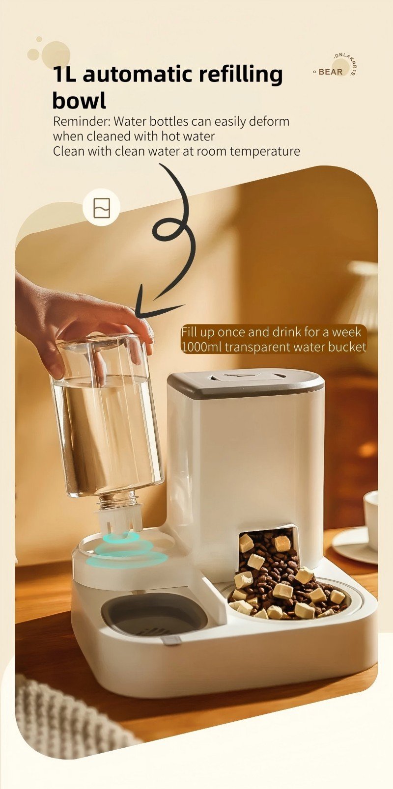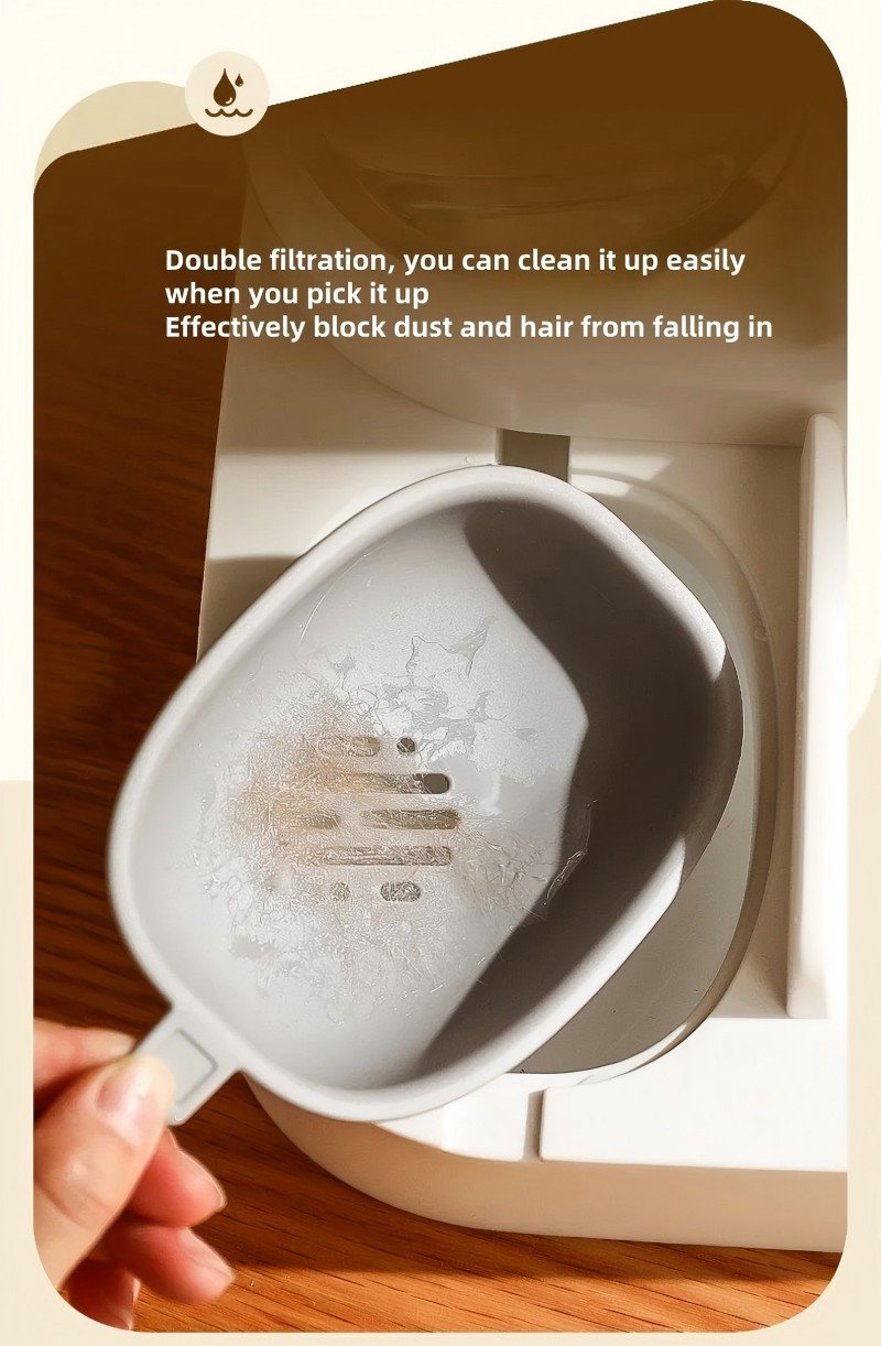 【2-in-1 Dispenser】1L water dispenser and 2.2lb food bin. The automatic cat feeder automatically replenishes water and food into the plate so your pet won't feel hungry regardless of whether you're at home or not